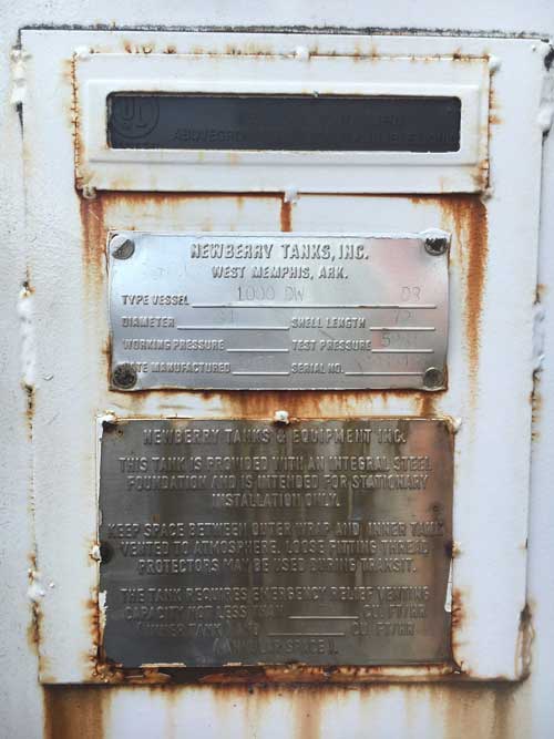 1,000 Gallon Double-Walled Above Ground Fuel Storage Tank | UL 142 Year built: 05 Size of Tank: 1,000 Gal. Type of Tank: Double-walled steel UL Rating: N/A Any Issues (Leaks, etc.): None Additional Equipment: N/A Dimensions: 6 x 10 GET A QUOTE Contact Info First Name * Last Name * Company Best Phone # to call between 9a - 5p EST * Best Time To Call EST * Please select one9a-10a10a-11a11a-12p12p-1p1p-2p2p-3p3p-4p4p-5pAny - Im always available Best Day To Call * Please select oneMondayTuesdayWednesdayThursdayFridayAny - I'm always available Email * Billing Street Address 1 * Billing City * Billing State * Billing Postal Code * Job Title * Please select oneGeneral ContractorPetroleum Contractor (PEI Dealer)Fuel Distribution Company Rep.EngineerArchitectPurchase Agent - Private Corp.Purchase Agent - GovernmentPrivate BuyerOther Quote Details Application Type * Please select oneAutomotiveGeneratorCommercial ResidentialConstructionFarm/ RanchHotel/ HospitalityManufacturingMarineMunicipalityNursing or Health Care FacilityPrivate ResidentialSanitationTruckingMilitary/ GovEducation Required Features * Please select oneBare Tanks OnlyComplete Turnkey Storage & Dispensing SystemUsed TanksParts Fuel Capacity * Please select one500 Gallons1k Gallons2k Gallons3k Gallons4k Gallons5k Gallons6k Gallons8k Gallons10k Gallons12k Gallons15k Gallons20k Gallons25k Gallons30k Gallons Fuel Type * Please select oneUnleaded GasDiesel (on-road)Diesel (off-road)Bio-dieselJet-AAV GasEthanolMethanolRace FuelD.E.F.Diesel and GasolineMultiple Octane GasolinesOther Required Certifications * Please select oneDOT Certified - Transportable With FuelBasic - UL 142 (Single Wall)Flameshield - UL 142 (Double Walled)Fireguard - UL 2085 (Double Walled w/ Concrete Divider)Unsure - Need Help DecidingNone Ideal Delivery Time Frame * Please select one1 - 2 Weeks30 Days60 - 90 Days3 - 6 MonthsMore Than 6 MonthsUnknown - Investigating Options Only Portability Requirements * Please select oneContinuously Relocated w/ Fuel1 to 2 Times Per Year1 Time Over Next 5 Years1 Time Over Next 10 Years1 Time Over Next 30 YearsNever - Will Remain In Fixed Location Approximate Project Budget * Please select one$15k - $30k$30k - $50k$50k - $100k$100k - $250k$250k - $500k$500k - $1mil$1mil +No Budget - Just Curious About Products Resale Value Importance * Not Important - Will Never ResellModerately Important - May Not Need System In the FutureVery Important - Want To Recoup Investment After A Time Additional Quote Notes Submit Related products SoldUsed Tank & System Market Place500 Gallon Double Wall Tank Read more SoldUsed Tank & System Market Place2,000 Gallon Doublewall Tank Read more SoldUsed Tank & System Market Place12,000 Gallon Double Walled Tank Read more